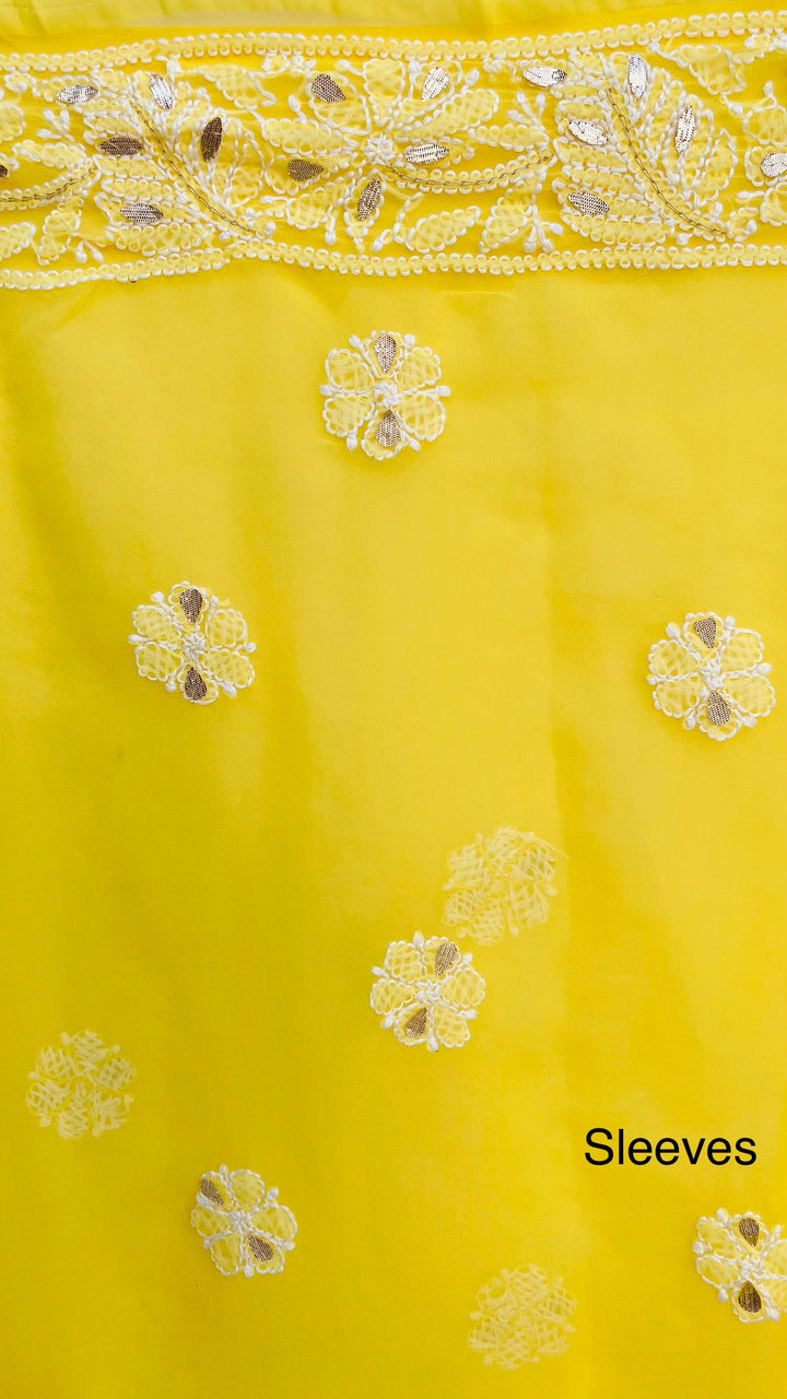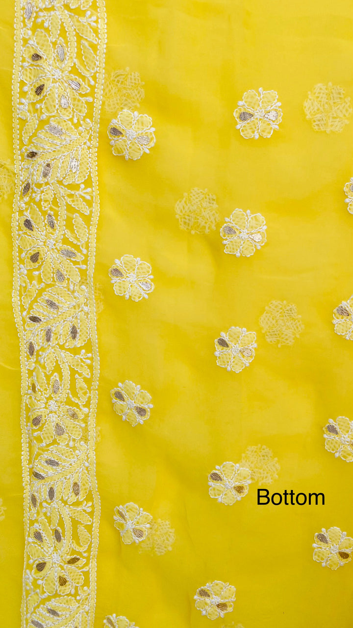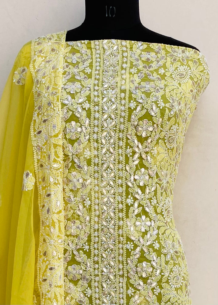 Lucknowi Chikankari Suit Length 3 Piece Yellow Georgette With Gotta Patti Work With Embroidered Georgette Dupatta & Embroidered Same Colour Georgette Bottom