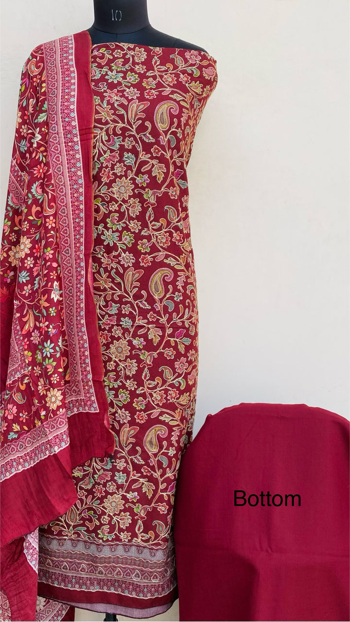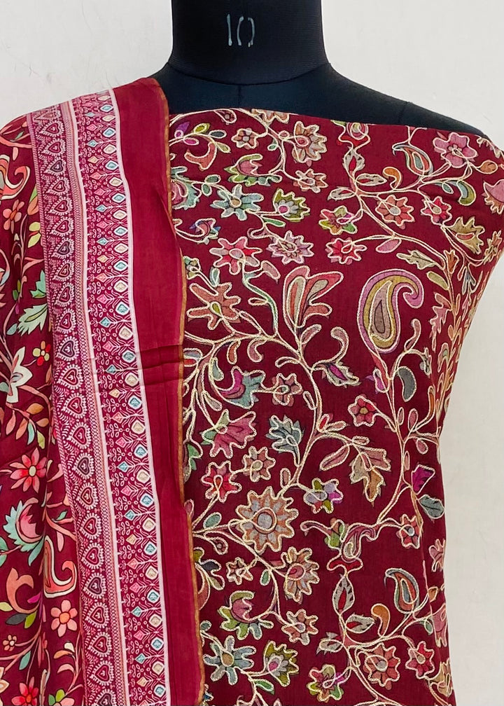 Maroon Woollen Pashmina Suit Length 3 Piece With Muslin Dupatta