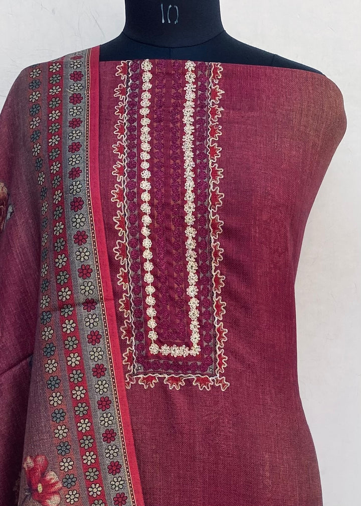 Maroon Woollen Pashmina Suit Length 3 Piece With Woollen Pashmina Shawl