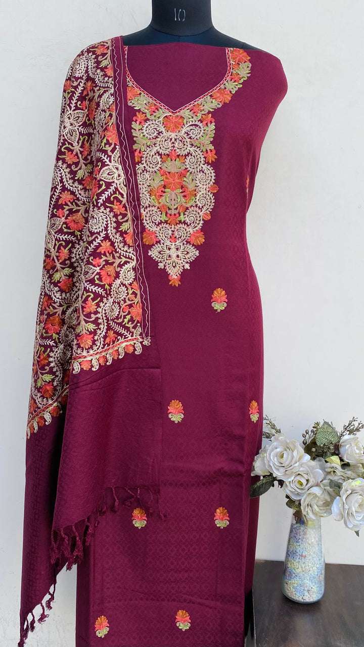 Maroon Woollen Pashmina Suit Length 3 Piece With Embroidered Woollen Pashmina Shawl