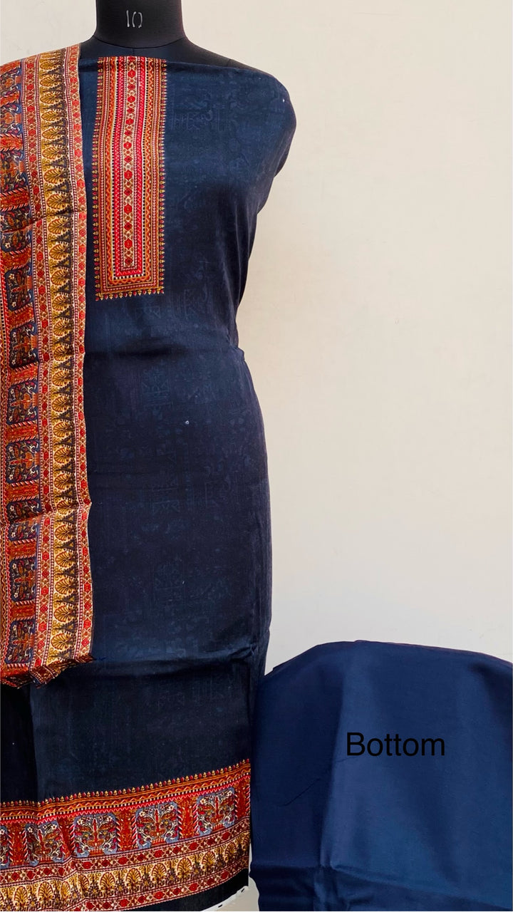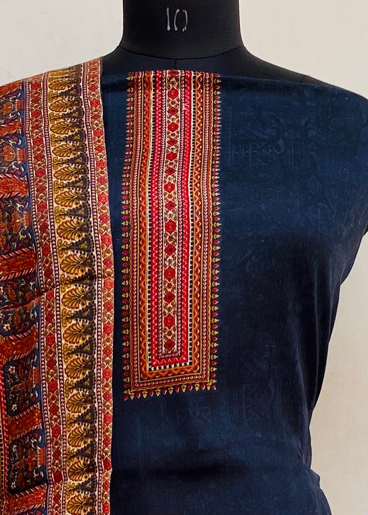 Navy Blue Woollen Pashmina Suit Length 3 Piece With Woollen Pashmina Shawl