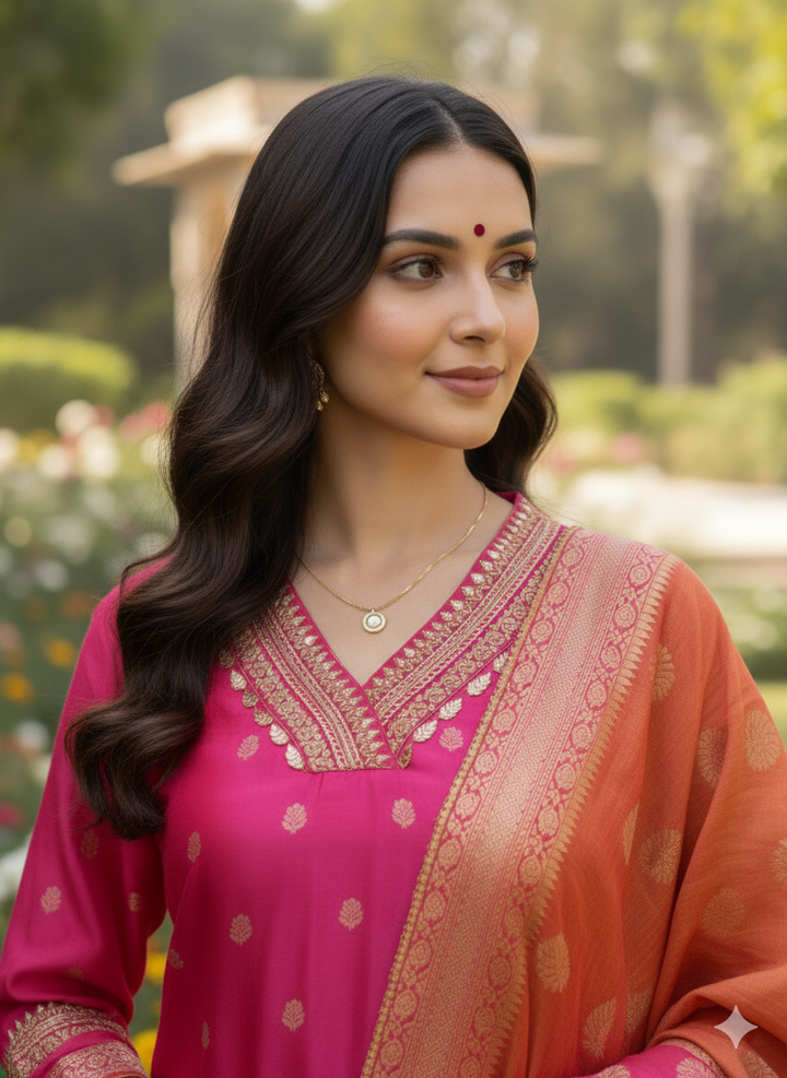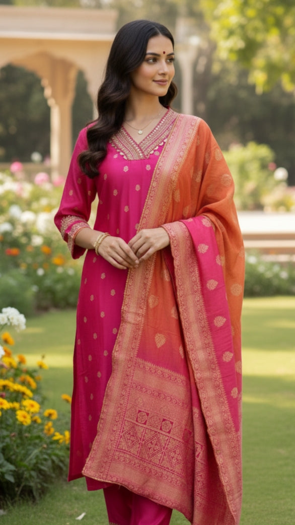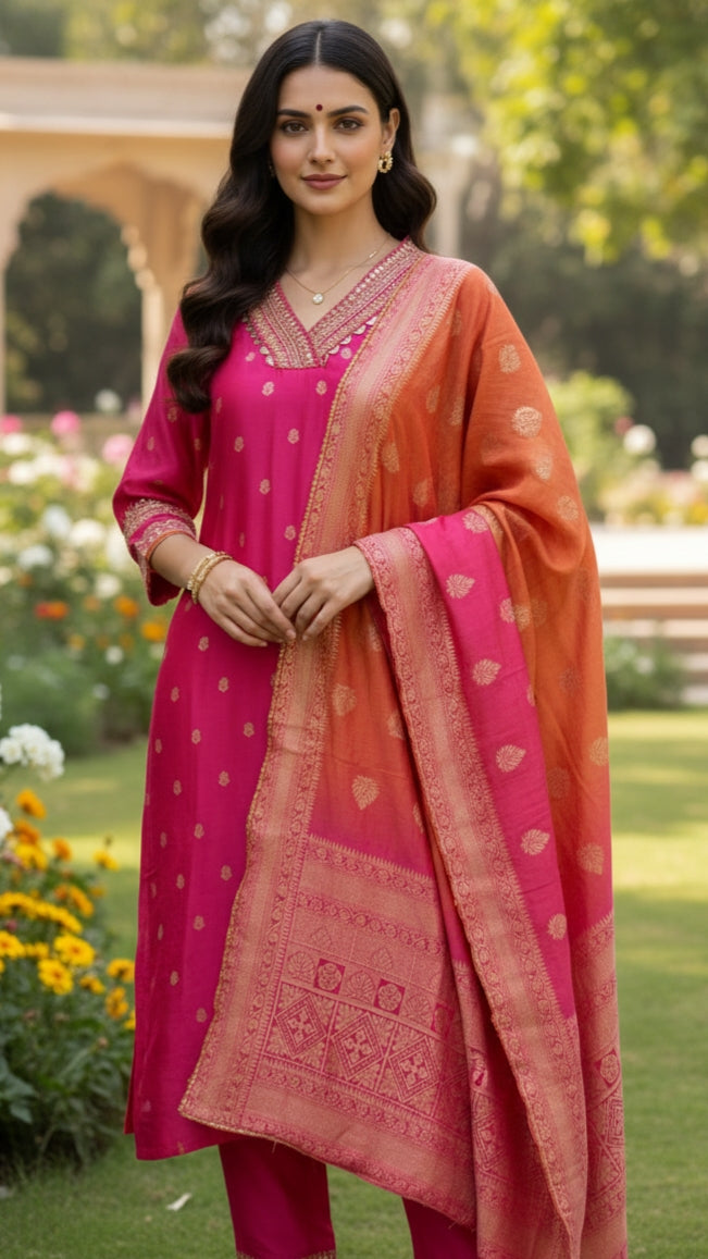 Step into a world of timeless elegance with the 'Rani' Radiance set, a stunning ensemble designed to make you the center of every celebration. This captivating outfit pairs a rich, Rani Pink (Hot Pink) silk-blend kurta and matching trousers with an exquisite dual-tone dupatta that embodies heritage craftsmanship.