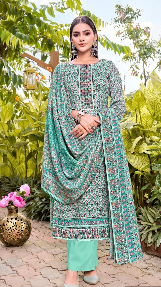 Blue Pashmina Suit Length 3 Piece with Pashmina Dupatta with Same colour Pashmina Bottom.