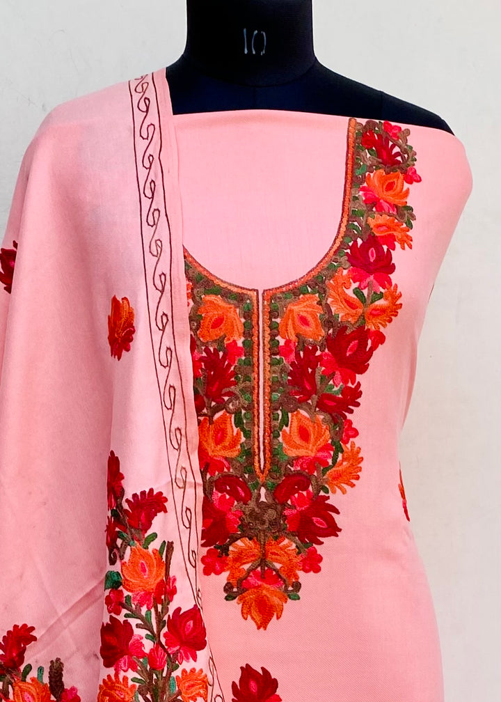 Pink Woollen Pashmina Suit Length 3 Piece With Embroidered Woollen Pashmina Shawl