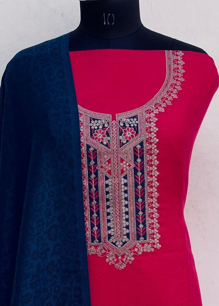 Pink Woollen Pashmina Suit Length 3 Piece With Woollen Pashmina Shawl