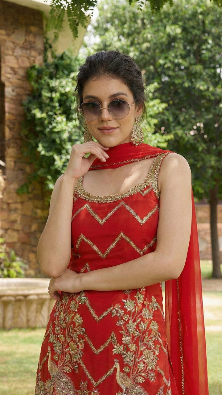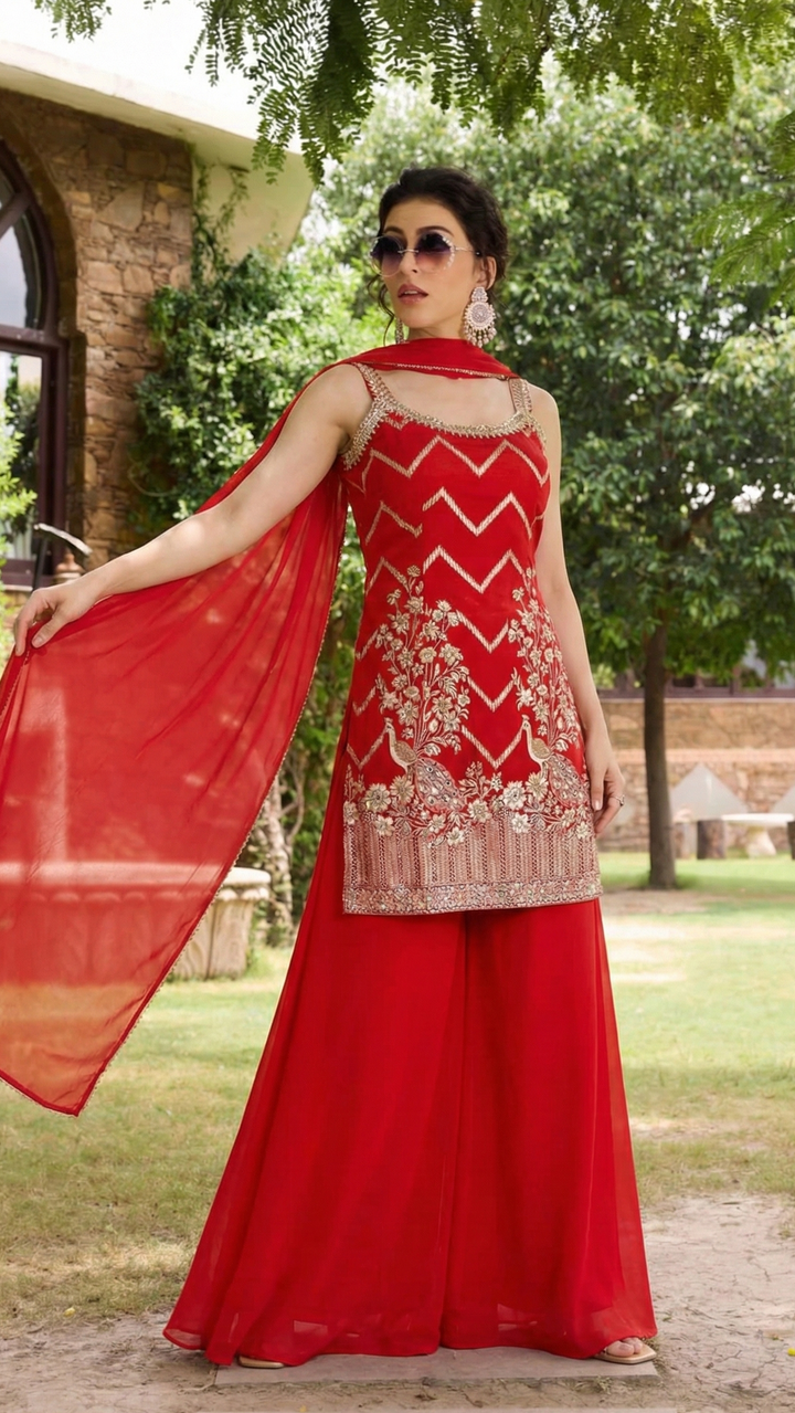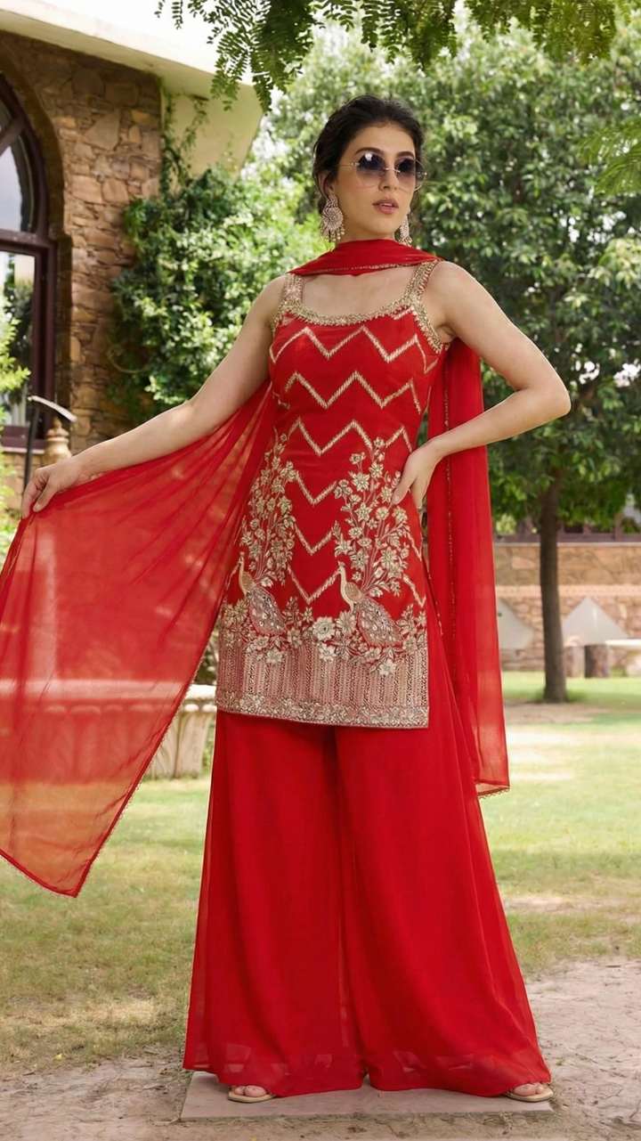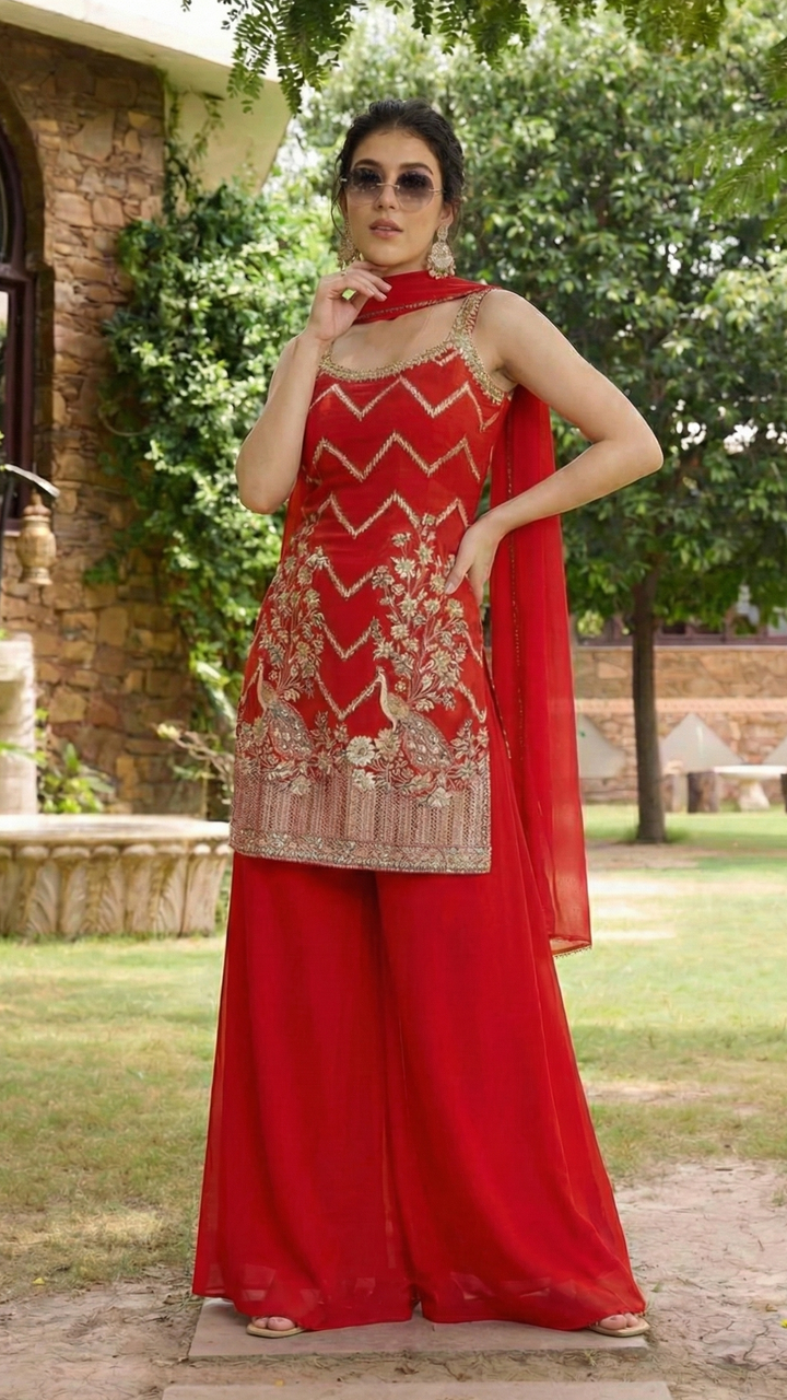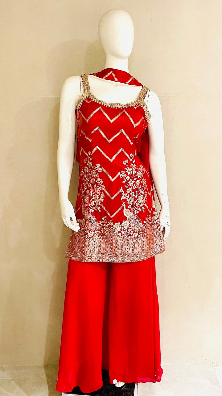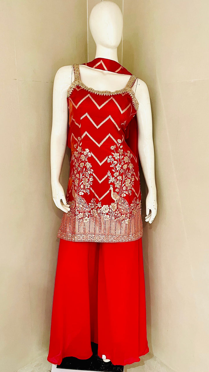 Celebrate tradition with a fresh twist – this Banarsi Silk short kurti palazzo set is the perfect blend of vibrant hues, timeless craft, and modern-day charm. This stunning suit set features a short kurti with intricate Peackock Design in a beautiful red colour. Perfect for Occasions this dress is the perfect pick this festive season