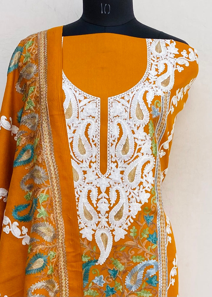 Rust Woollen Pashmina Suit Length 3 Piece With Embroidered Woollen Pashmina Shawl