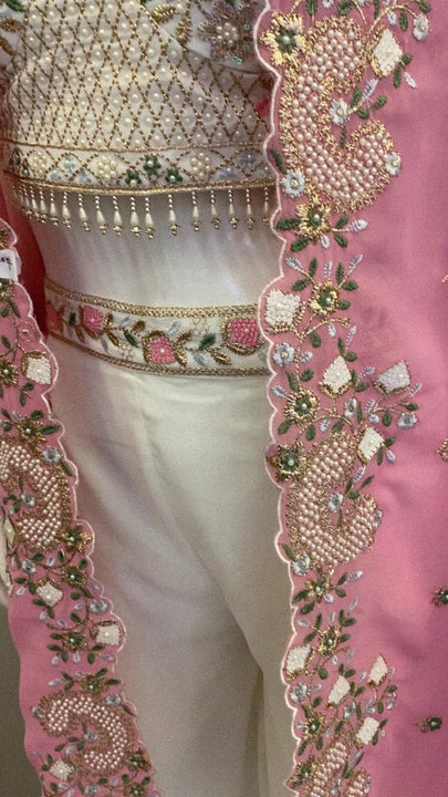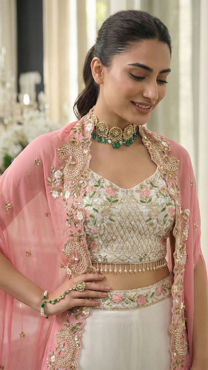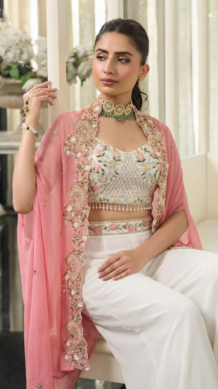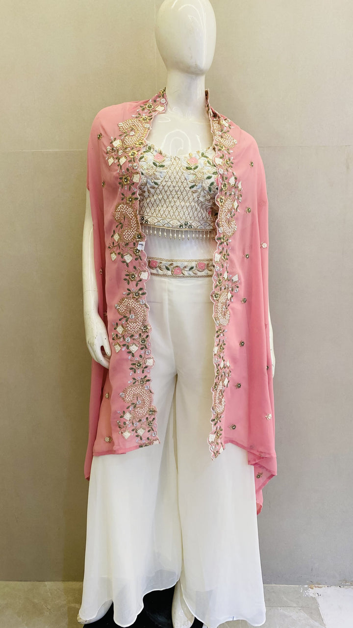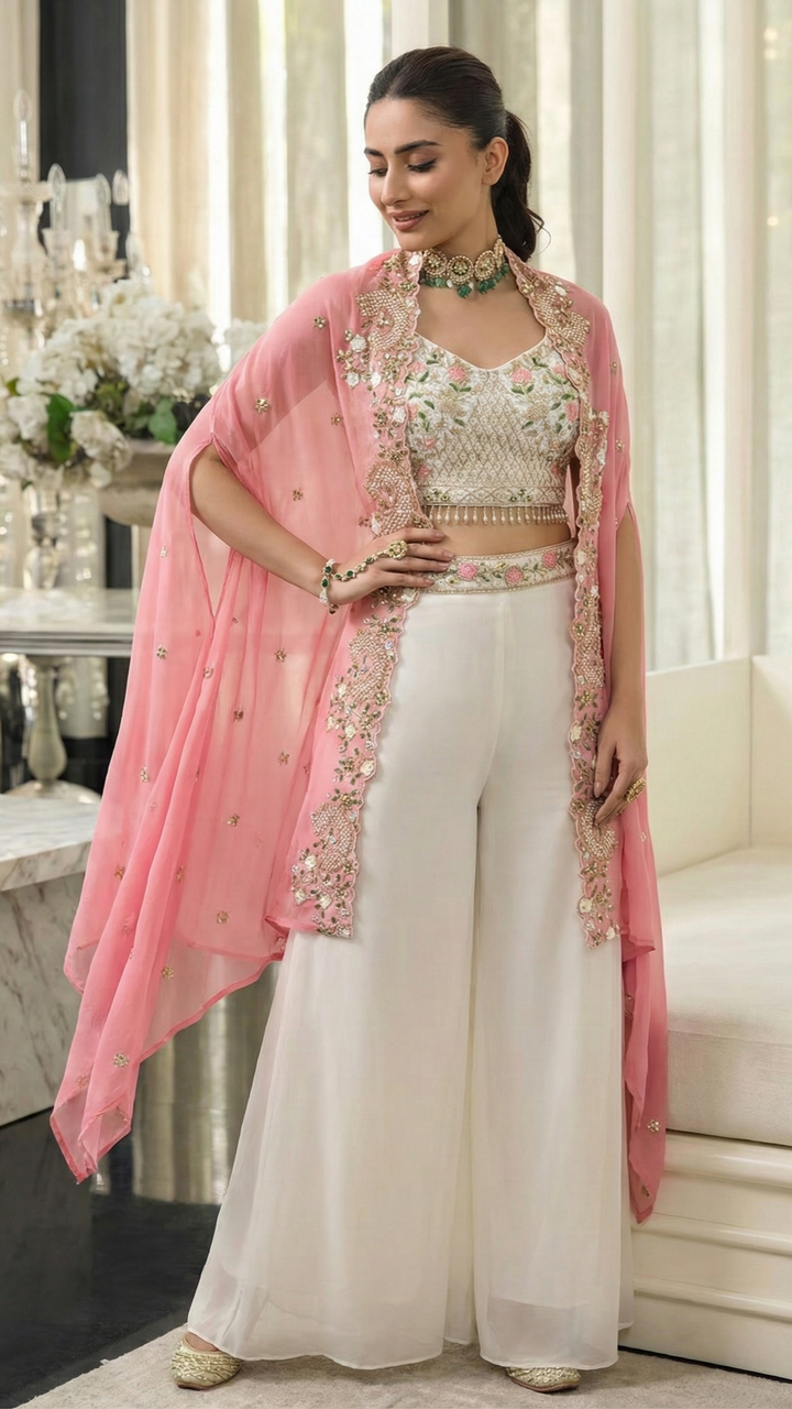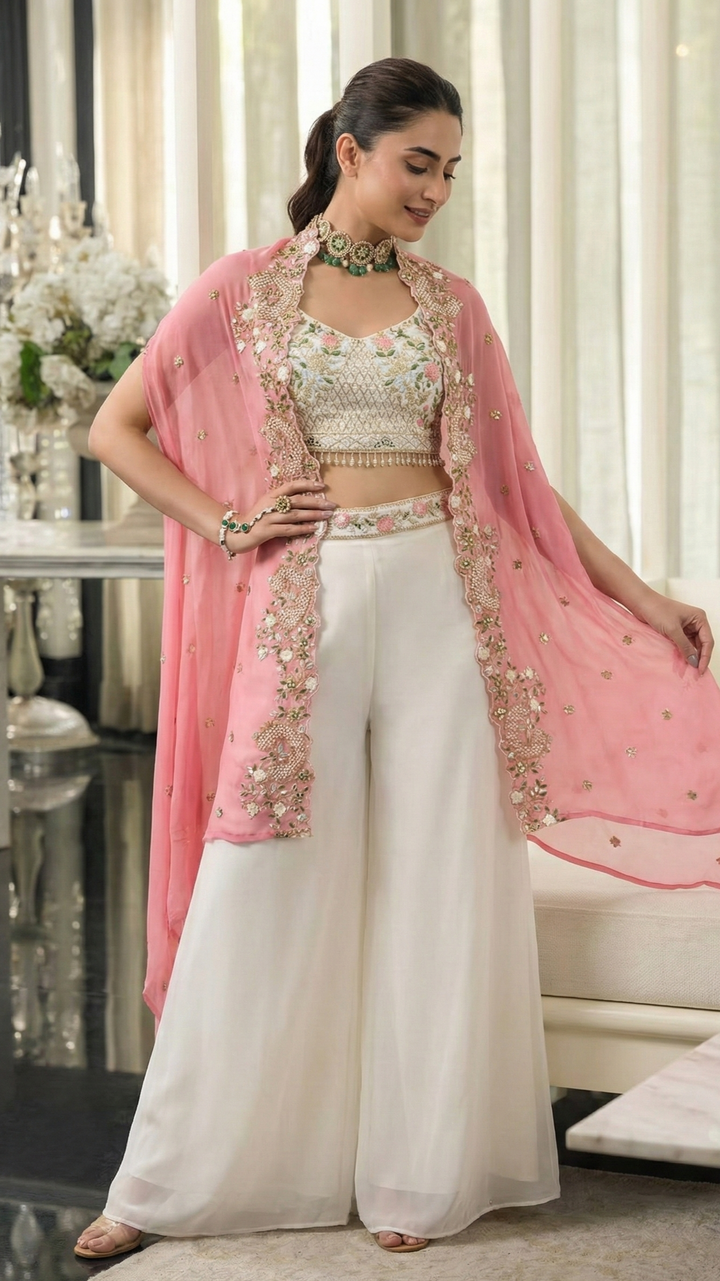 Embrace the timeless allure in our White Indowestern Crop Top Palazzo with Cape Set at festive events. The crop top is designed in incut waistline adorned with crystal drops and is embellished with 3D petals, resham, sequins, beads and stones work. It is paired with a palazzo fabricated in georgette fabric. It is teamed up with a cape in floral prints accentuated with resham, sequins, beads and stones work detailing. Move through endless functions in style with this stylish indowestern set. Flaunting a modern design uplift your festive look with dazzling diamond floral stud earrings and high heels.