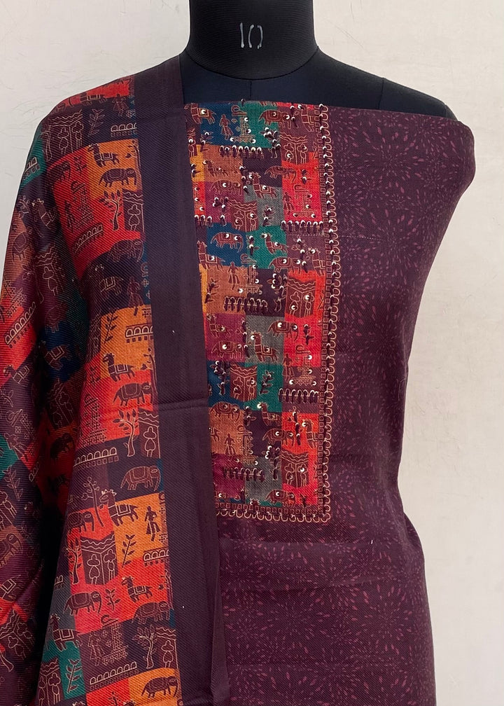 Wine Woollen Pashmina Suit Length 3 Piece With Woollen Pashmina Shawl