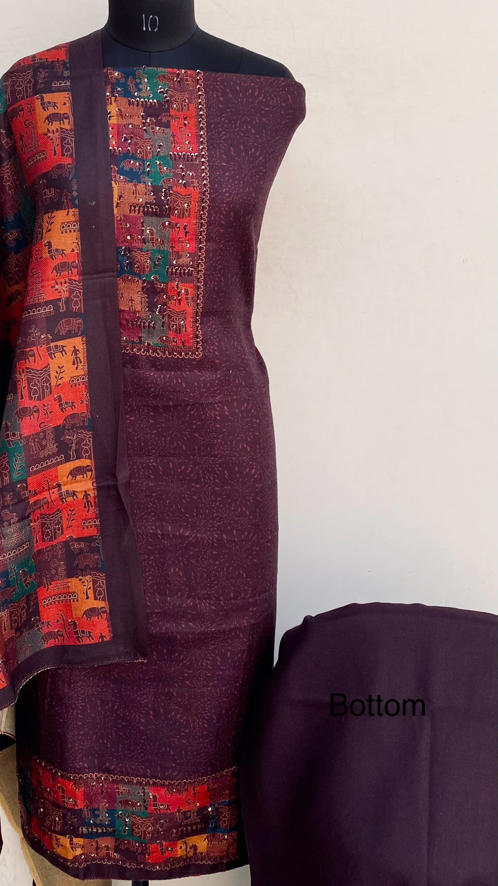 Wine Woollen Pashmina Suit Length 3 Piece With Woollen Pashmina Shawl & Same Colour Pashmina Bottom