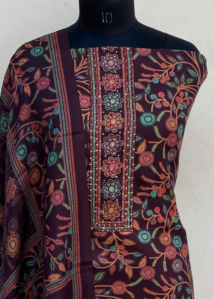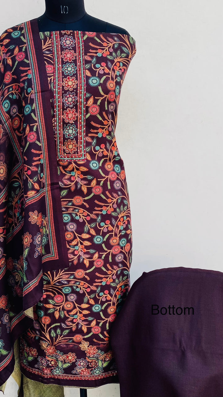 Wine Woollen Pashmina Suit Length 3 Piece With Sequence Work With Woollen Pashmina Shawl & Same Colour Pashmina Bottom