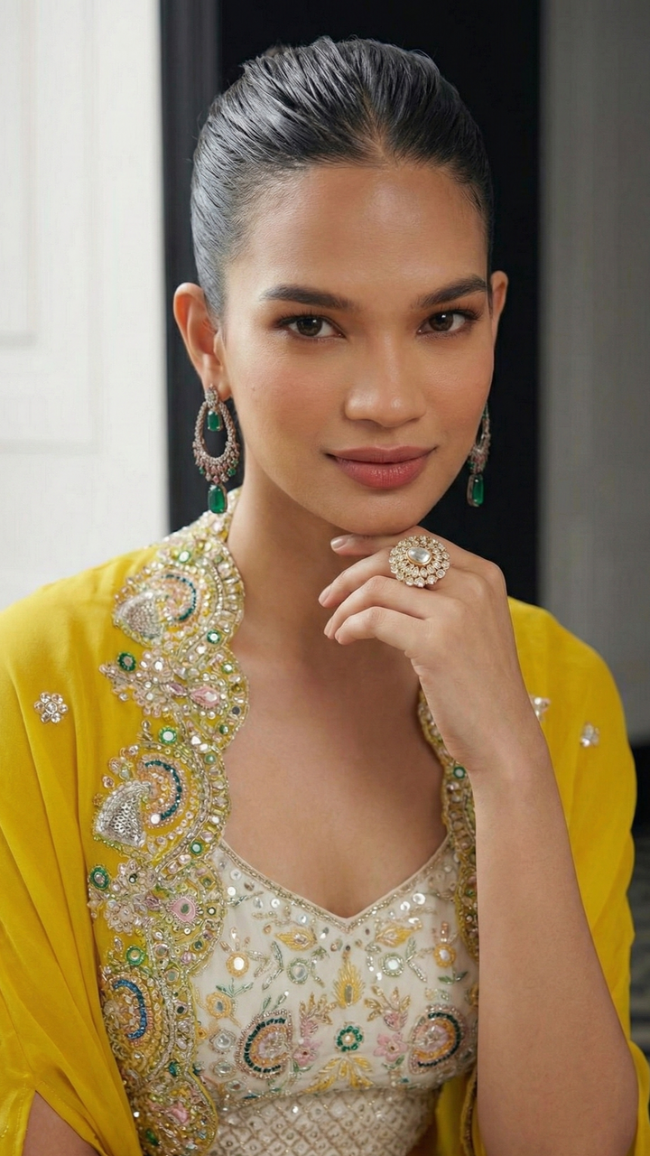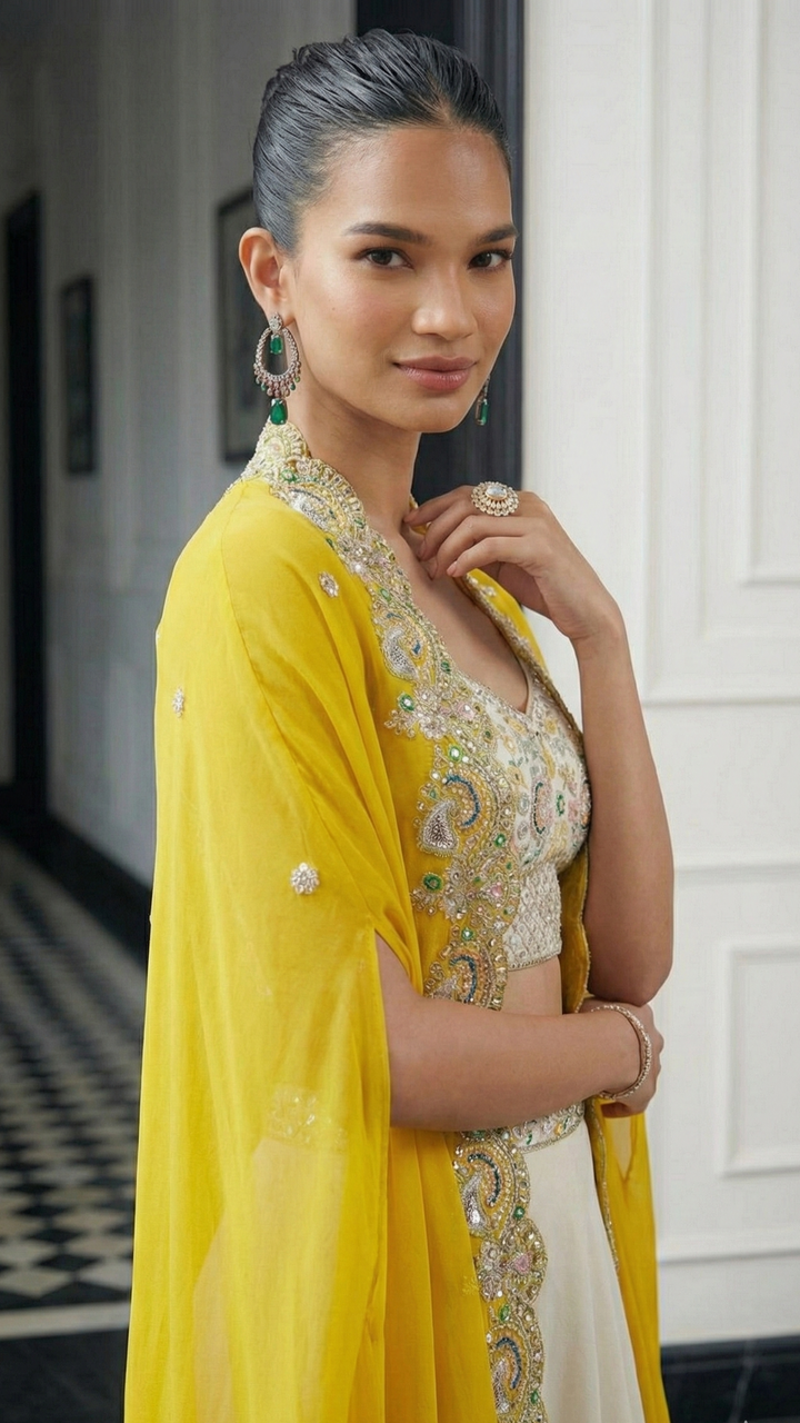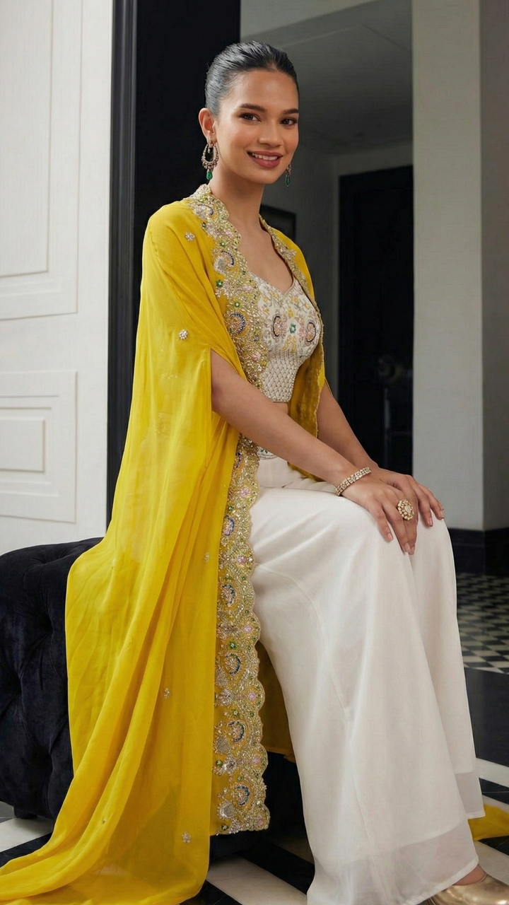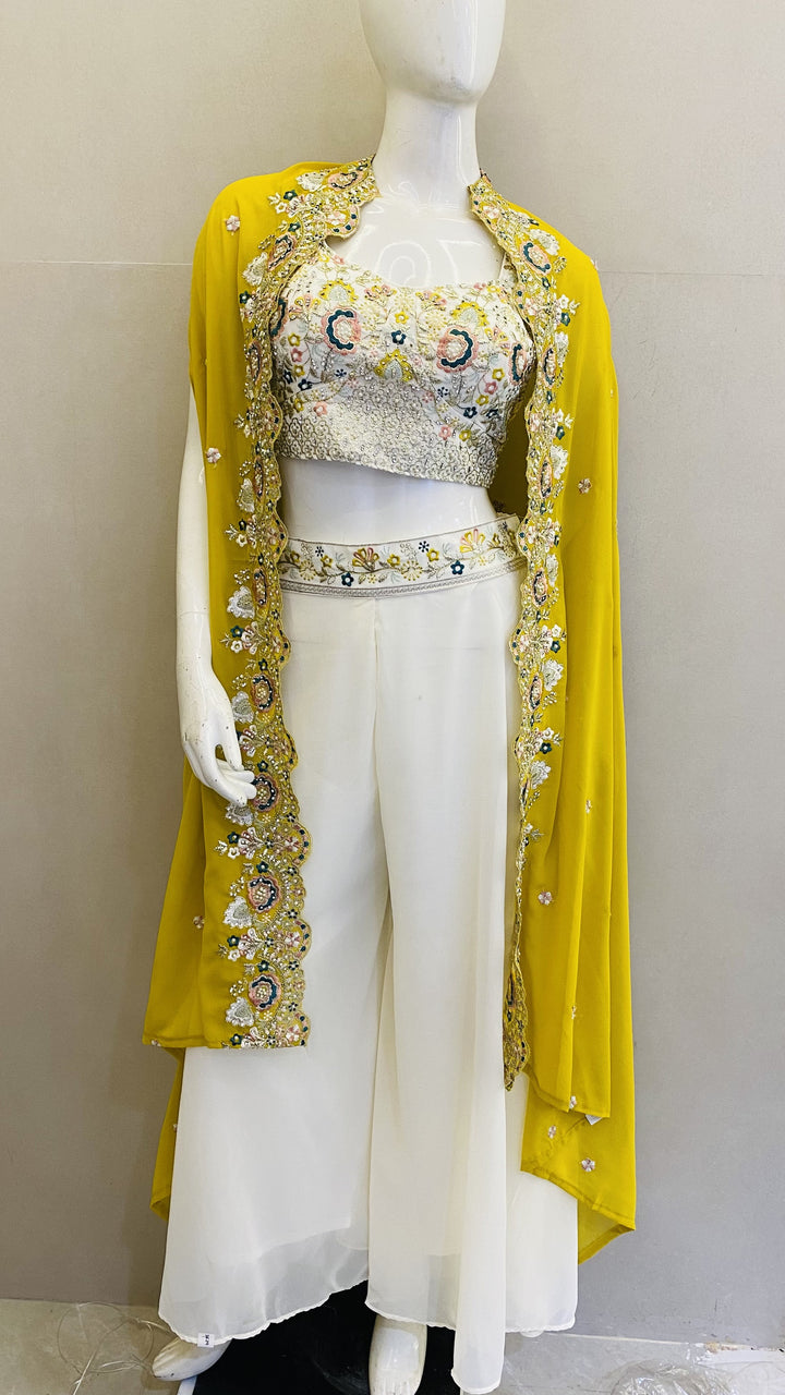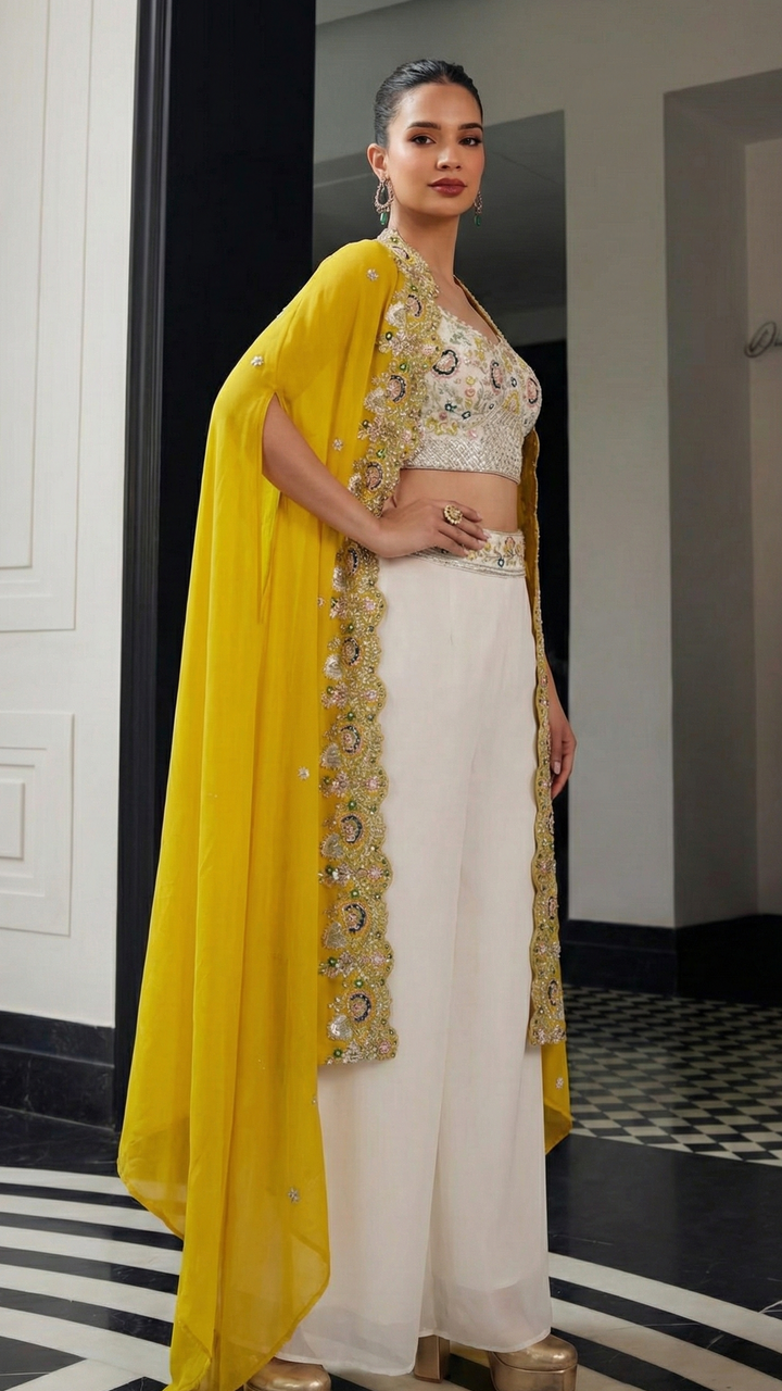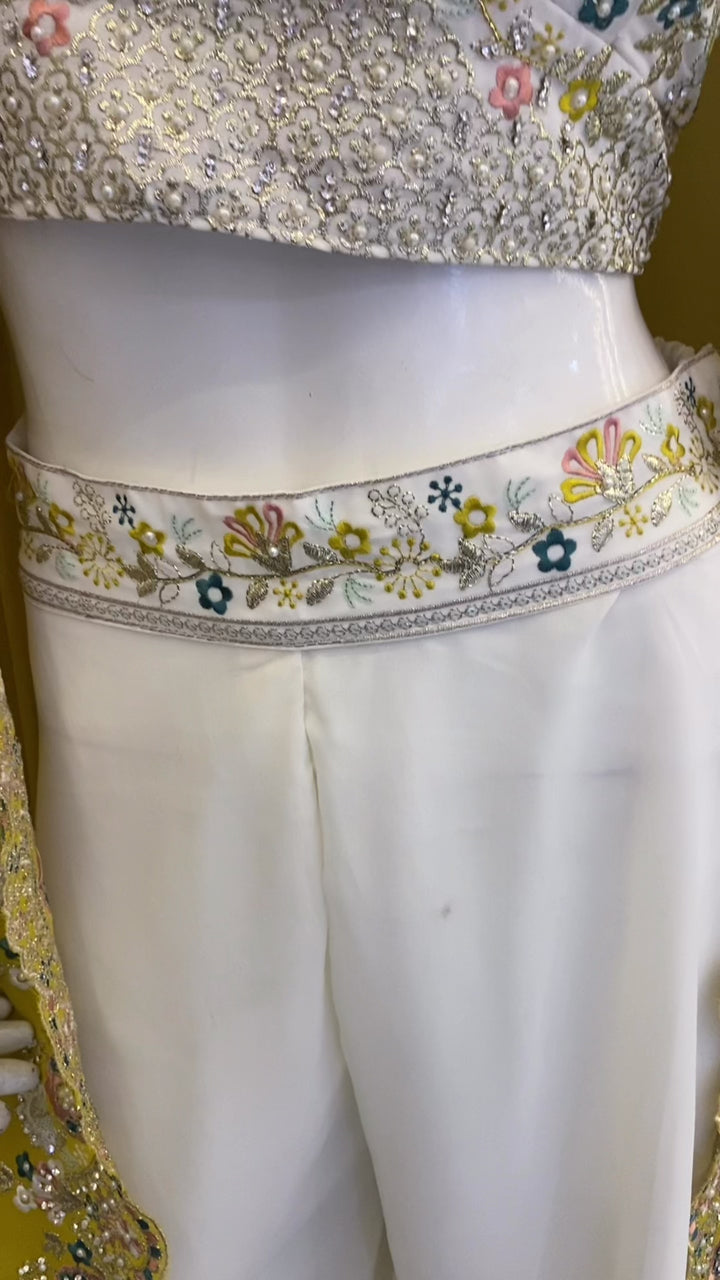 Embrace the timeless allure in our White Indowestern Crop Top Palazzo with Cape Set at festive events. The crop top is designed in incut waistline adorned with crystal drops and is embellished with 3D petals, resham, sequins, beads and stones work. It is paired with a palazzo fabricated in georgette fabric. It is teamed up with a cape in floral prints accentuated with resham, sequins, beads and stones work detailing. Move through endless functions in style with this stylish indowestern set. Flaunting a modern design uplift your festive look with dazzling diamond floral stud earrings and high heels.